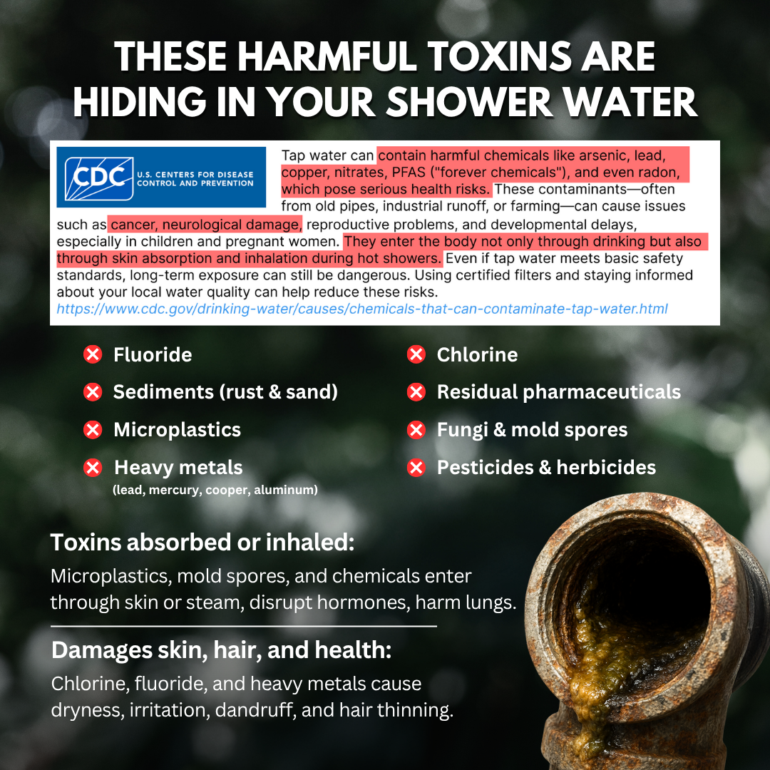 U.S. tap water has been found to contain over 300 contaminants - including chemicals like chlorine, fluoride, heavy metals, and hard water minerals. These aren’t just in your pipes - they’re hitting your skin and scalp every single day.